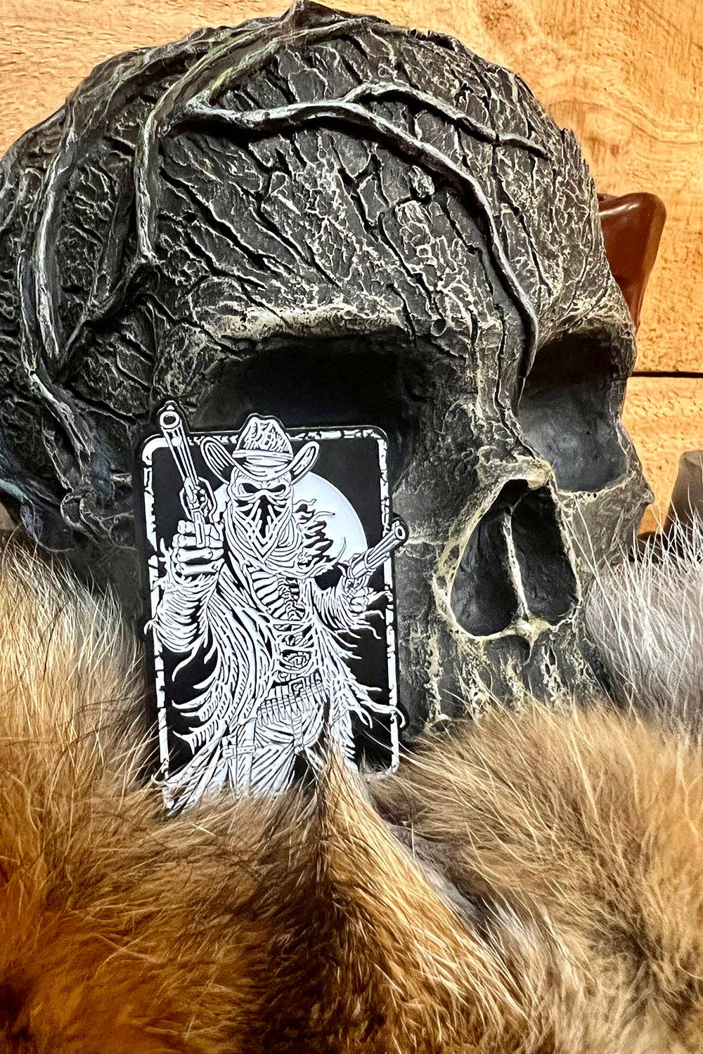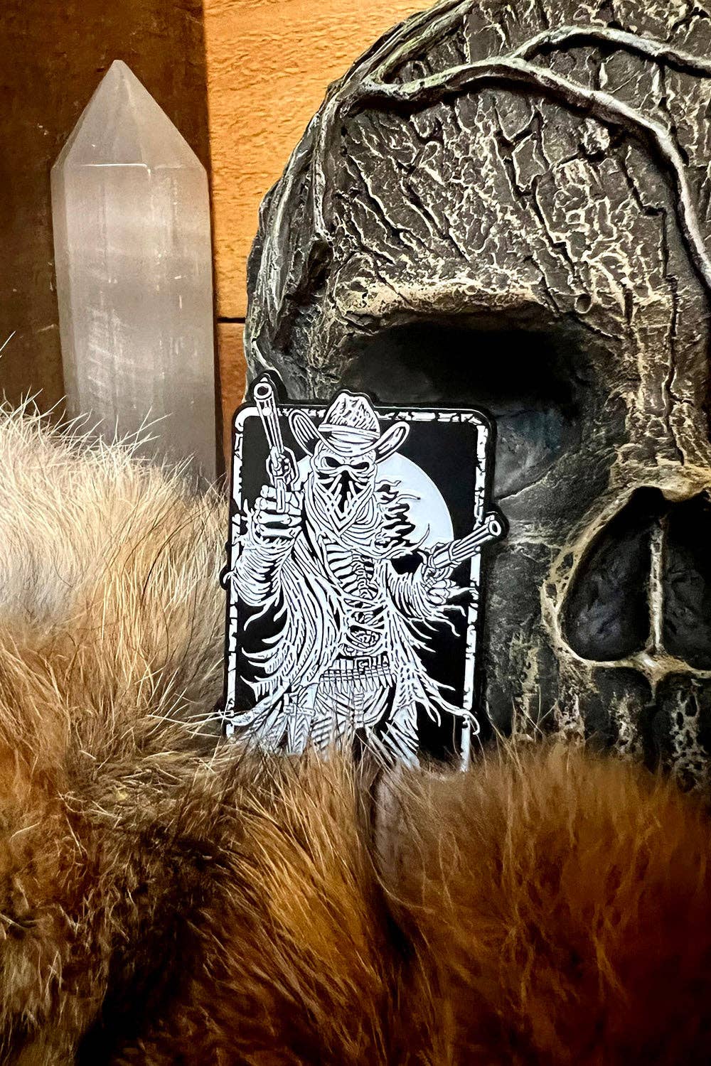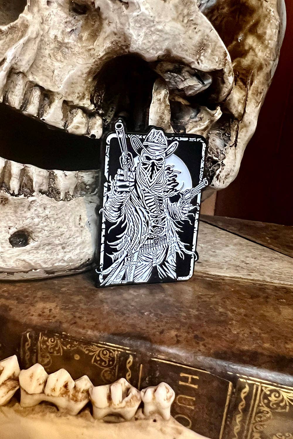 Ammo in my blood—the wicked West in my veins. * Goth Cowboy Pin. * Double Button Clutch. * Purple Rubber Backs. * Expertly Engraved. * 2" H x 1.3" W. * 100% Metal and Enamel.